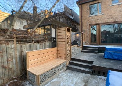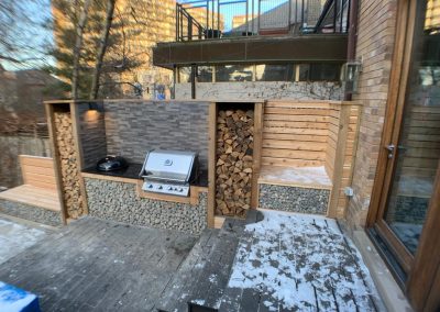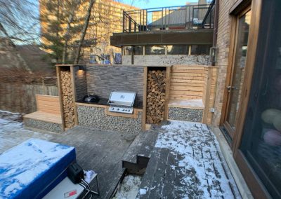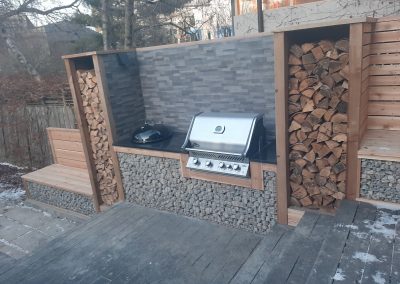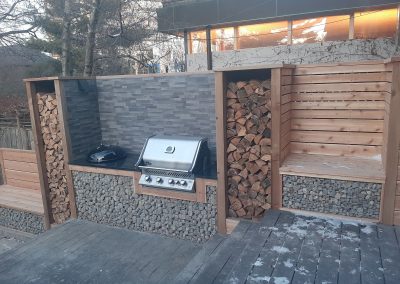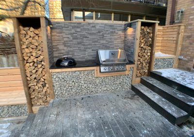 This outdoor kitchen presents a harmonious blend of functionality and natural aesthetics. Set against a backdrop of mixed stone gabion walls, the space features a built-in, high-end stainless steel grill alongside a classic black dome charcoal smoker, catering to diverse culinary preferences. A thoughtful inclusion of stacked firewood within arm’s reach not only serves a practical purpose but also adds a rustic charm to the ambiance. The wood storage is smartly integrated into the design, framing the cooking area and enhancing the overall structure. The sturdy wooden steps lead to this culinary nook, which is subtly lit to invite evening gatherings. The gray slate patio grounds the space with its solid presence, suggesting durability and readiness to entertain through all seasons. This installation demonstrates a keen eye for detail and an understanding of outdoor living spaces that are both elegant and purposeful.
