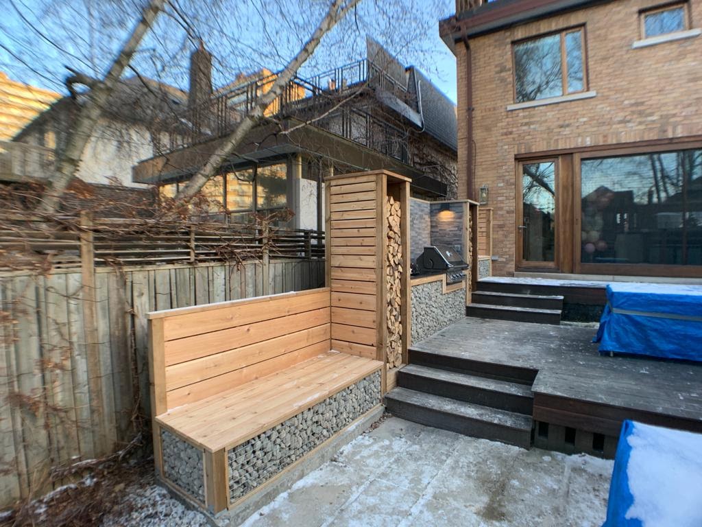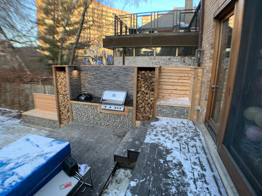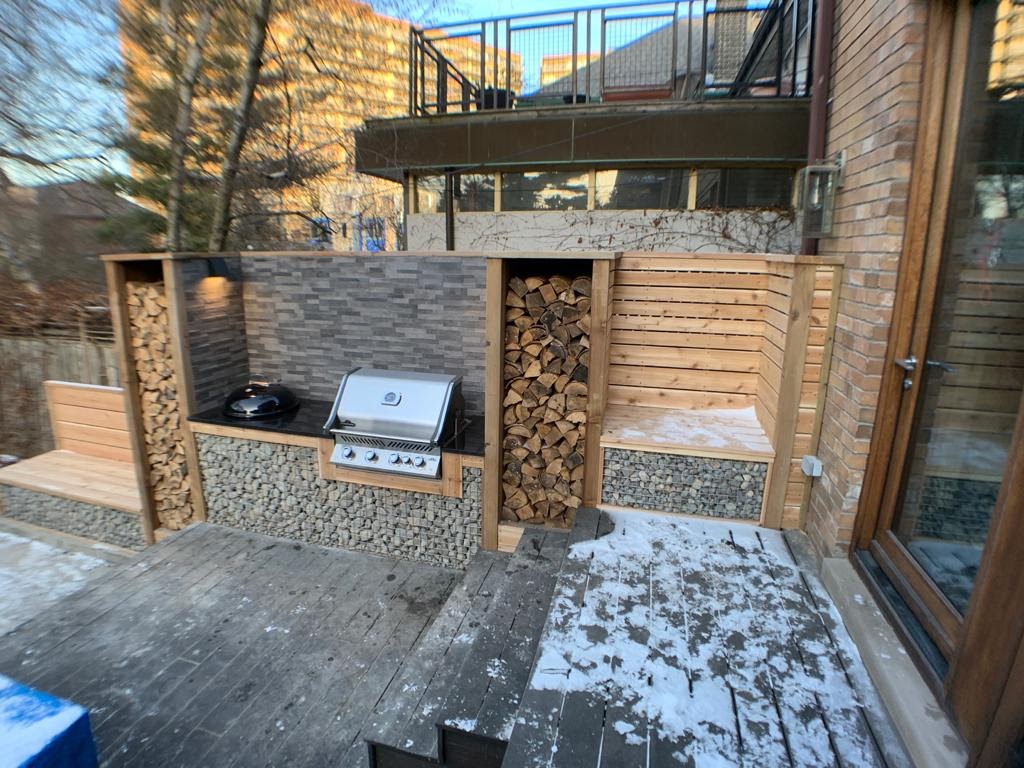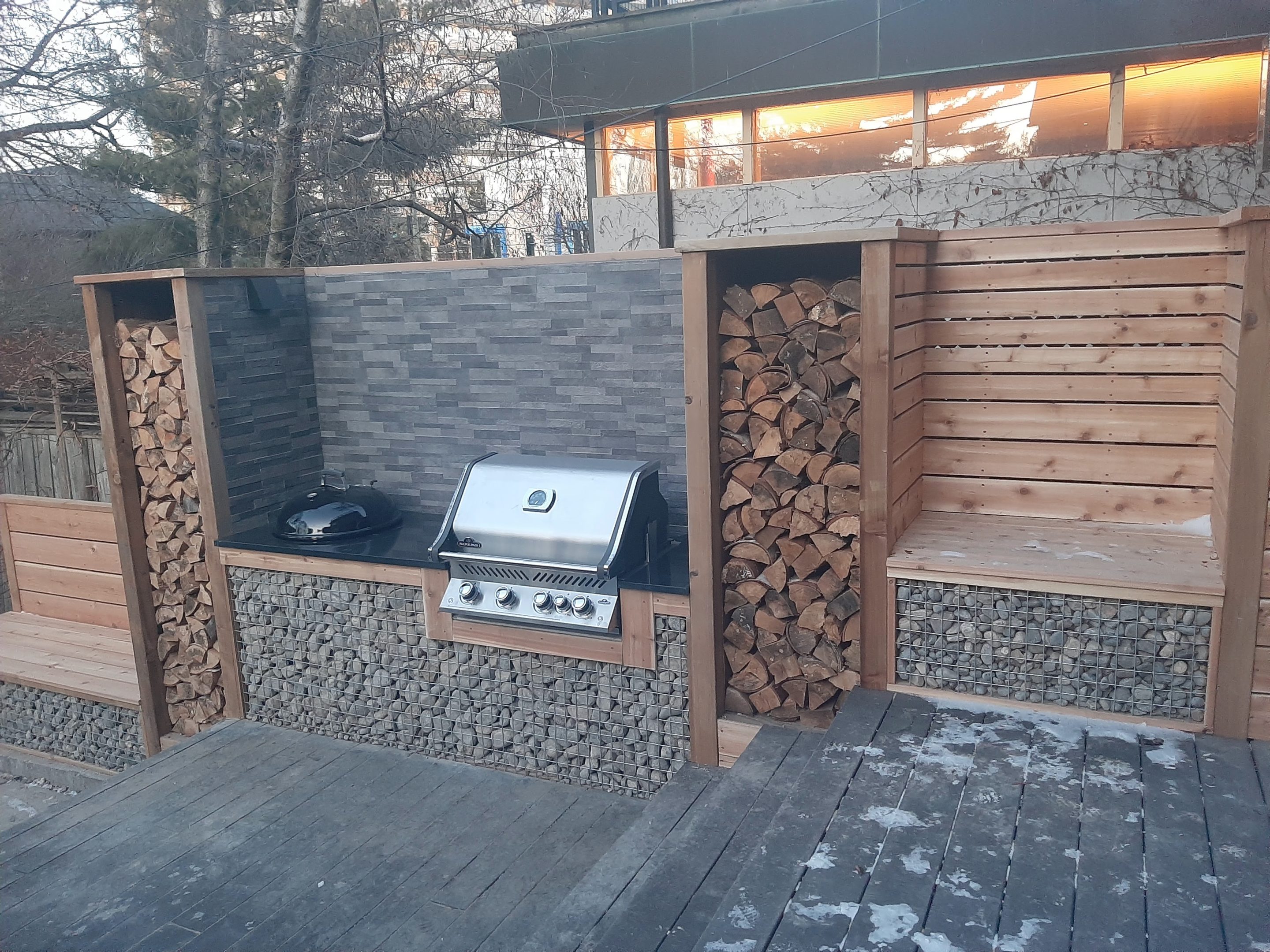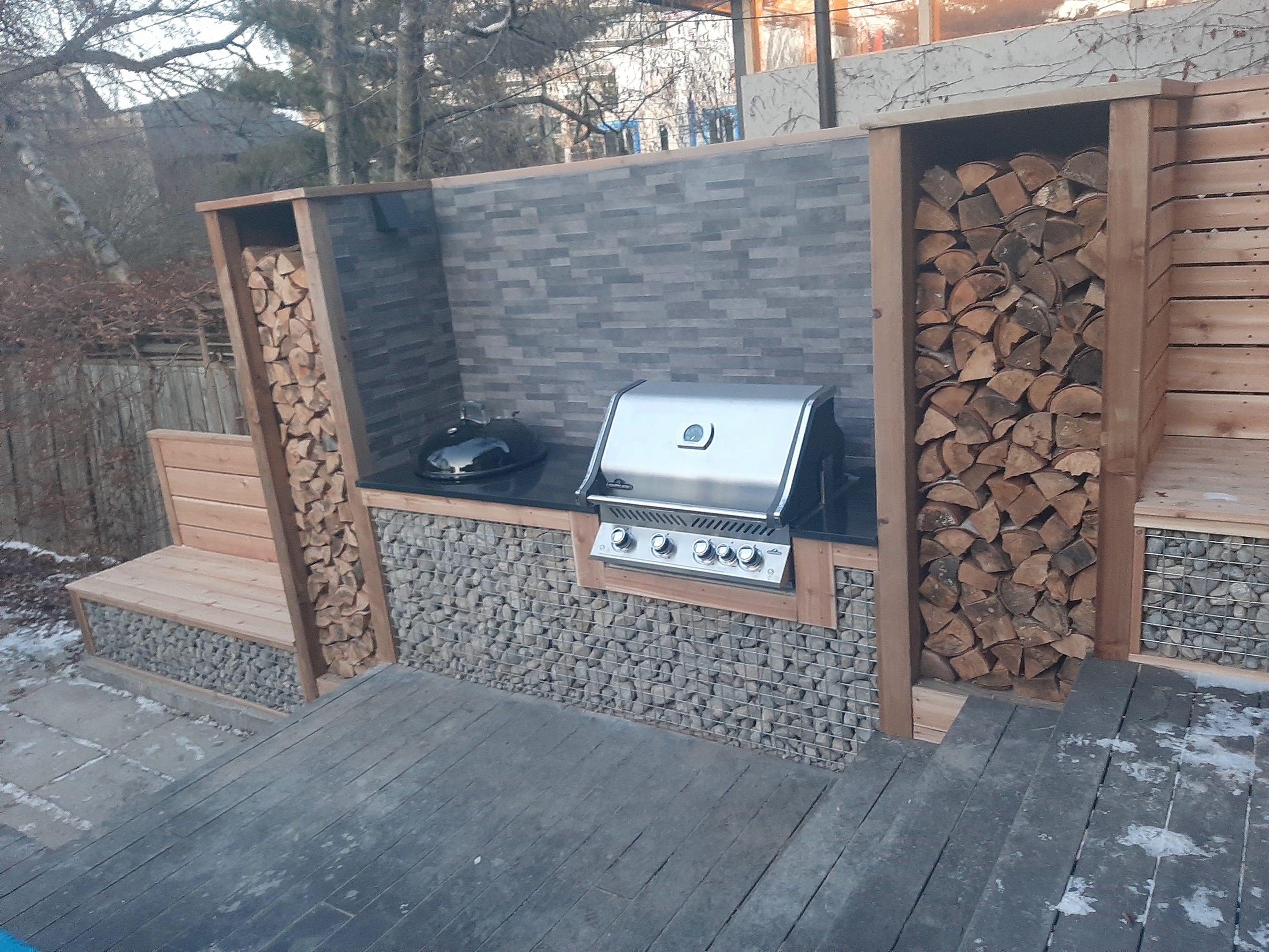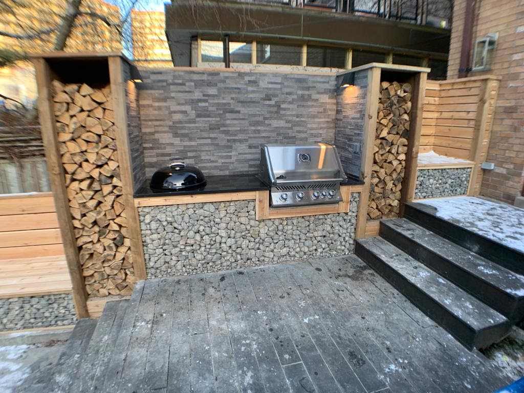 This outdoor kitchen presents a harmonious blend of functionality and natural aesthetics. Set against a backdrop of mixed stone gabion walls, the space features a built-in, high-end stainless steel grill alongside a classic black dome charcoal smoker, catering to diverse culinary preferences. A thoughtful inclusion of stacked firewood within arm’s reach not only serves a practical purpose but also adds a rustic charm to the ambiance. The wood storage is smartly integrated into the design, framing the cooking area and enhancing the overall structure. The sturdy wooden steps lead to this culinary nook, which is subtly lit to invite evening gatherings. The gray slate patio grounds the space with its solid presence, suggesting durability and readiness to entertain through all seasons. This installation demonstrates a keen eye for detail and an understanding of outdoor living spaces that are both elegant and purposeful.